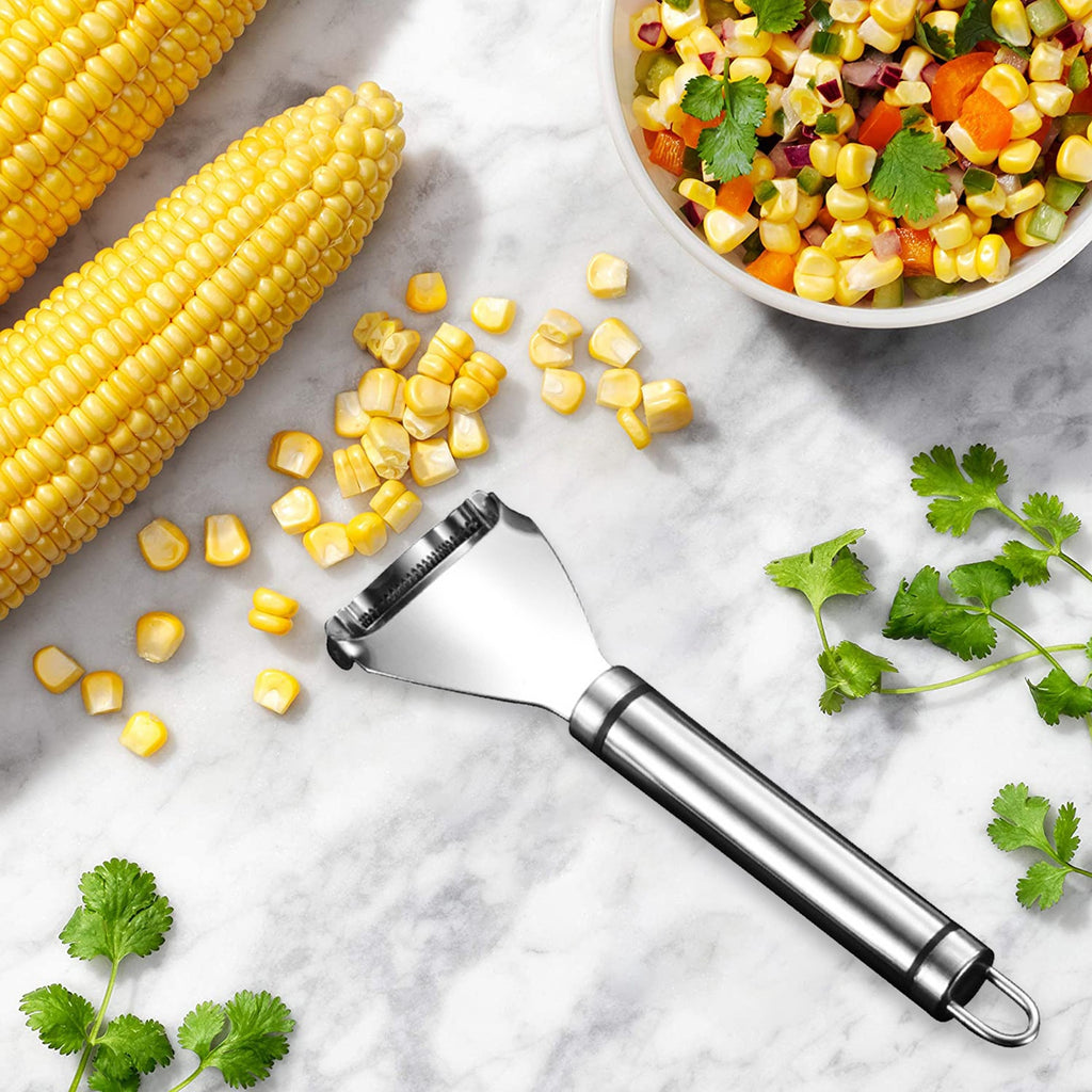Debulhadora de milho: o design serrilhado torna o raspador de milho mais afiado. A ferramenta de descascamento de espiga de milho é nivelada com o núcleo de milho, e remove o milho da espiga com um impulso rápido da mão.